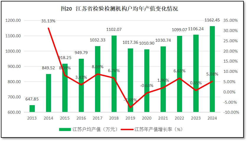 由图20可见,江苏省检验检测机构户均营业收入在2017年突破1000万元大关,在此之后增长率开始走低,户均营收保持在1100万元左右徘徊,2019和2020年还出现了小幅下降。江苏省检验检测机构户均年产值过去12年的平均年增长为5.83%左右,2024年的增长率为5.08%,总体保持稳定。