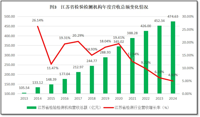 由图3可见,过去12年,江苏省检验检测机构年度营收增长很快,2024年末的行业年度营收总额达到474.63亿元,是2013年的4.49倍,年均增速达到14.81%。从增长率来看,在2020年之前,江苏省检验检测机构营收总额在高位波动,年均增速保持在18.51%左右,总体保持高速增长。2021年以来的4年,营收总额增速放缓,连续4年出现下降,2024年同比增速仅有4.93%,是12年来的最低值。