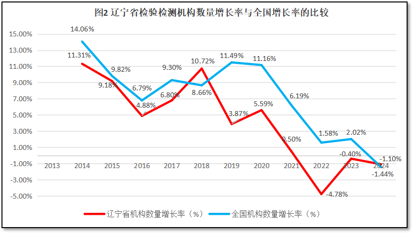 由图1可见,在2021年之前,河北省检验检测机构数量总体保持增长,但2021年之后检验检测机构数量较为稳定,基本保持不变。2024年末,河北省的检验检测机构数是2583家,是2013年末的1.81倍。12年来,河北省检验检测机构数量的年均增速为5.6%。从年度增长率曲线来看,河北省检验检测机构数量的增长率呈现波动变化的特点,每隔一两年就有一次大的涨跌,在2017和2020年先后出现超过10%的增长峰值,但2019和2022年接续出现较大跌幅。2023年增长率有轻微反弹,但2024年又一次出现减少。