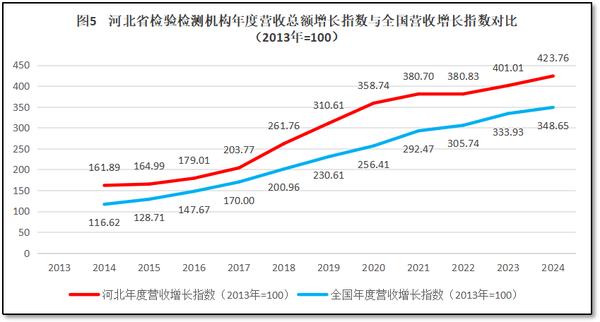 由上图可见,河北省检验检测机构营收总额增长指数一直保持着高于全国平均数的水平发展,曲线始终高于全国平均线,但高出不算太多,2024年增长指数相差75左右,最近几年的差距保持稳定。这说明河北省检验检测行业发展质量尚可,但没有显示出特别大的发展优势。