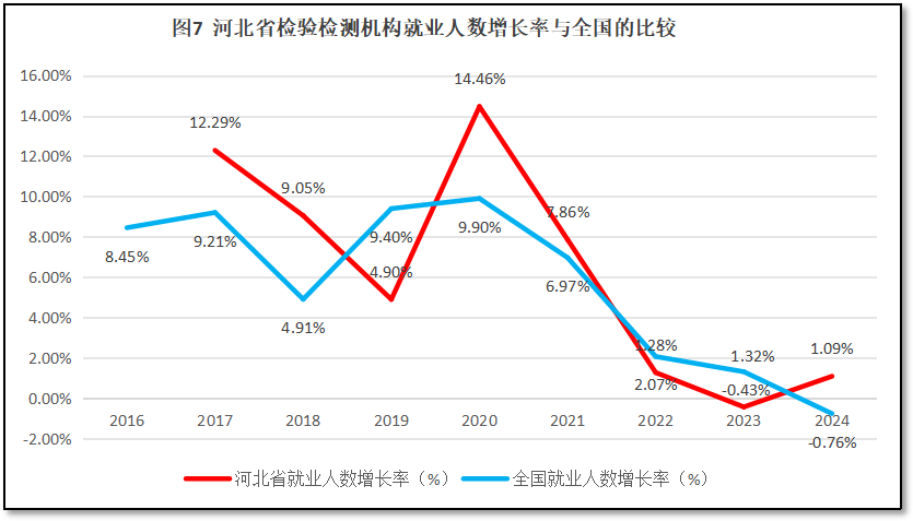 河北省检验检测机构就业人数增长率与全国检验检测机构就业人数增长率的比较,如图7所示。
