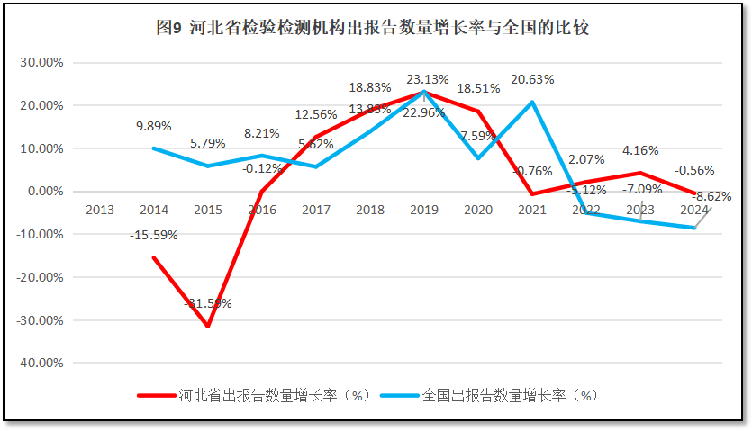 河北省检验检测机构出具报告数量的增长率与全国检验检测机构出具报告增长率的比较,如图9所示。